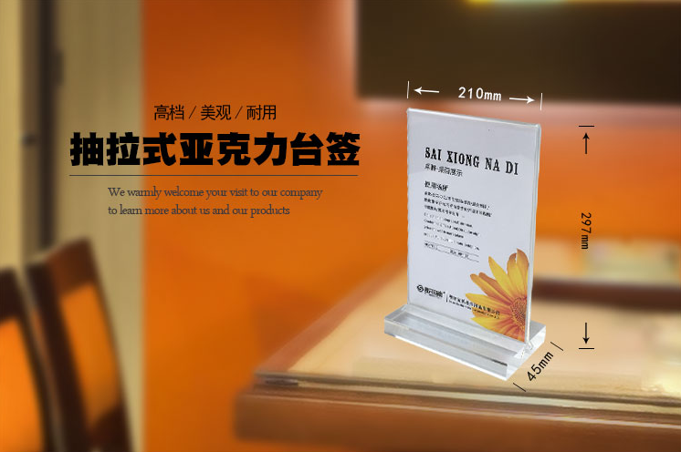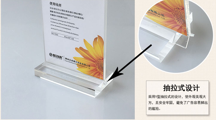 (2)亞克力桌牌采用Y型抽拉式設計,外觀美觀大氣,且安全牢固,避免廣告頁容易掉出的尷尬.